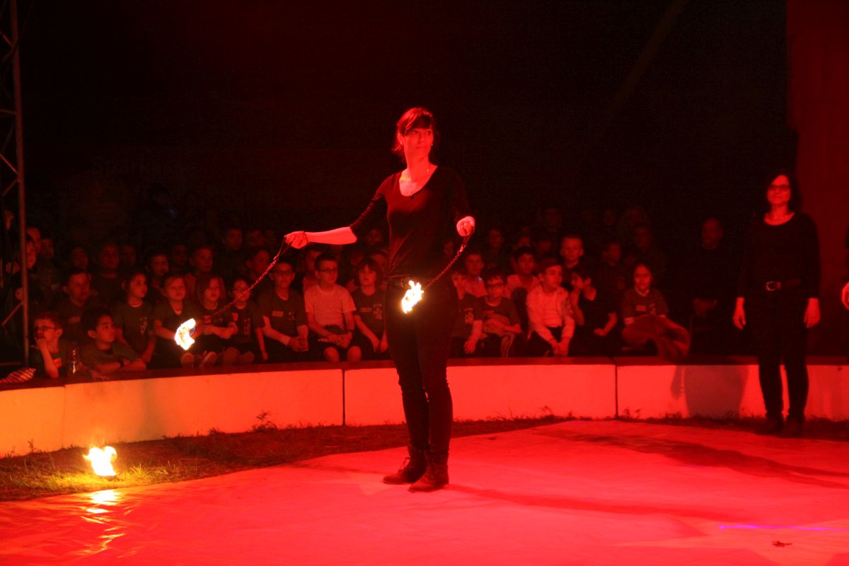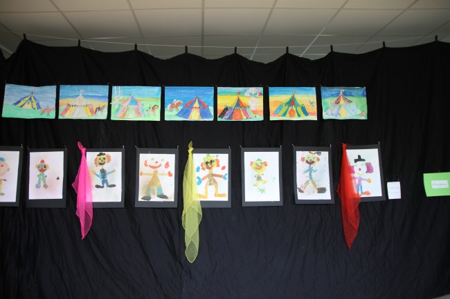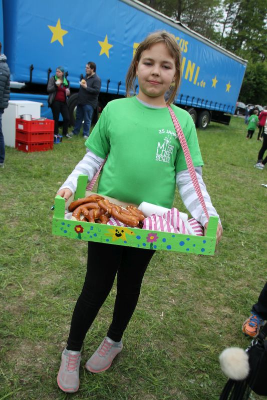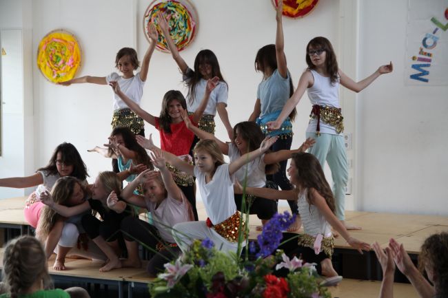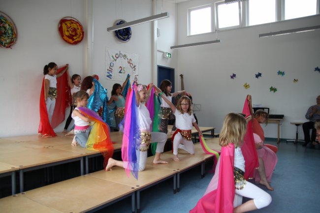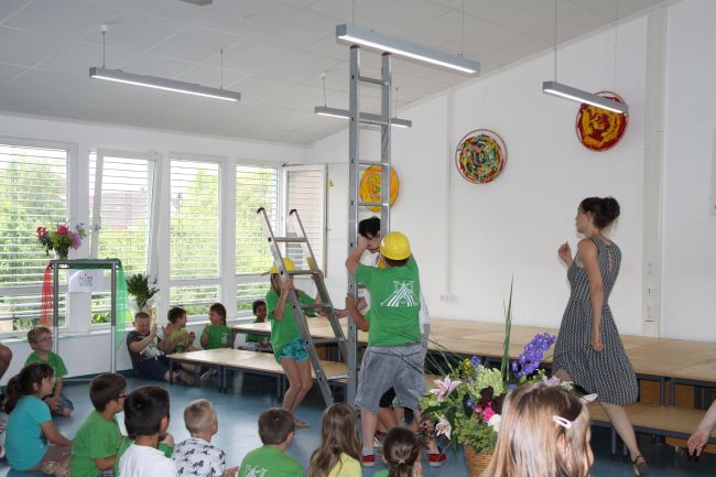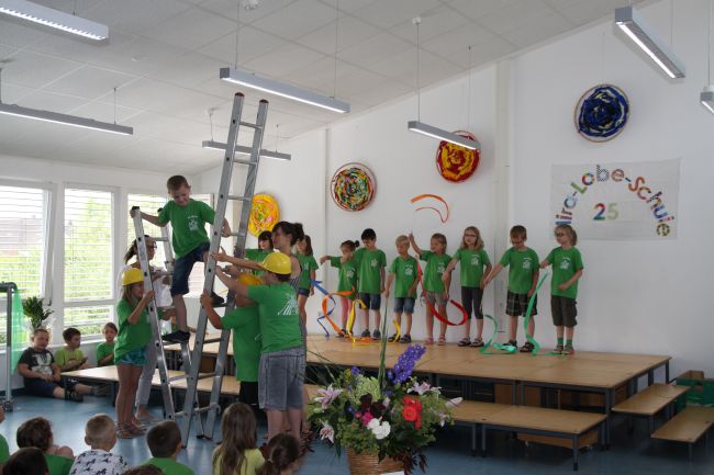 Dann heißt es Bühne frei für die Leiterartisten. Die beiden ersten Klassen zeigen eine Nummer aus dem Zirkusprojekt, welches mit dem Circus Baldini anlässlich des Jubiläums für die Kinder im April organisiert wurde.