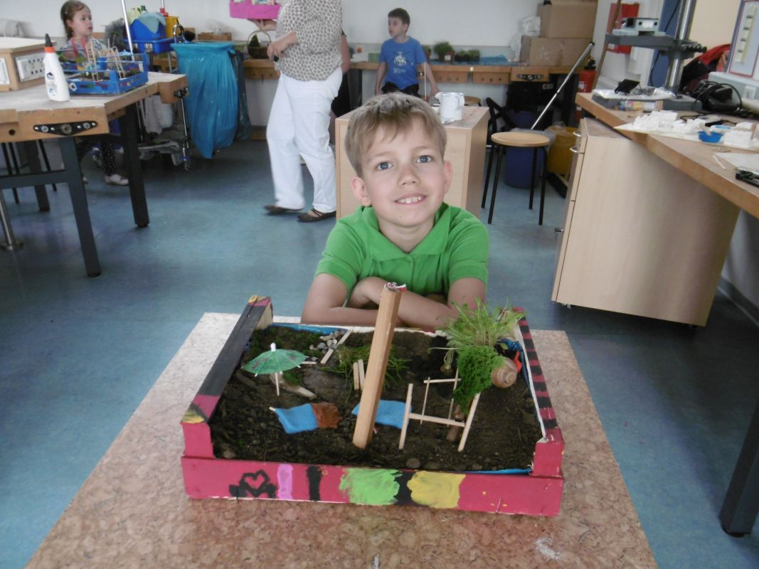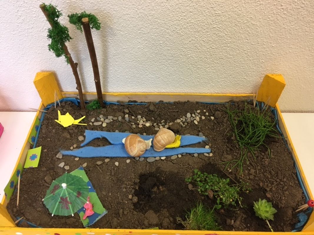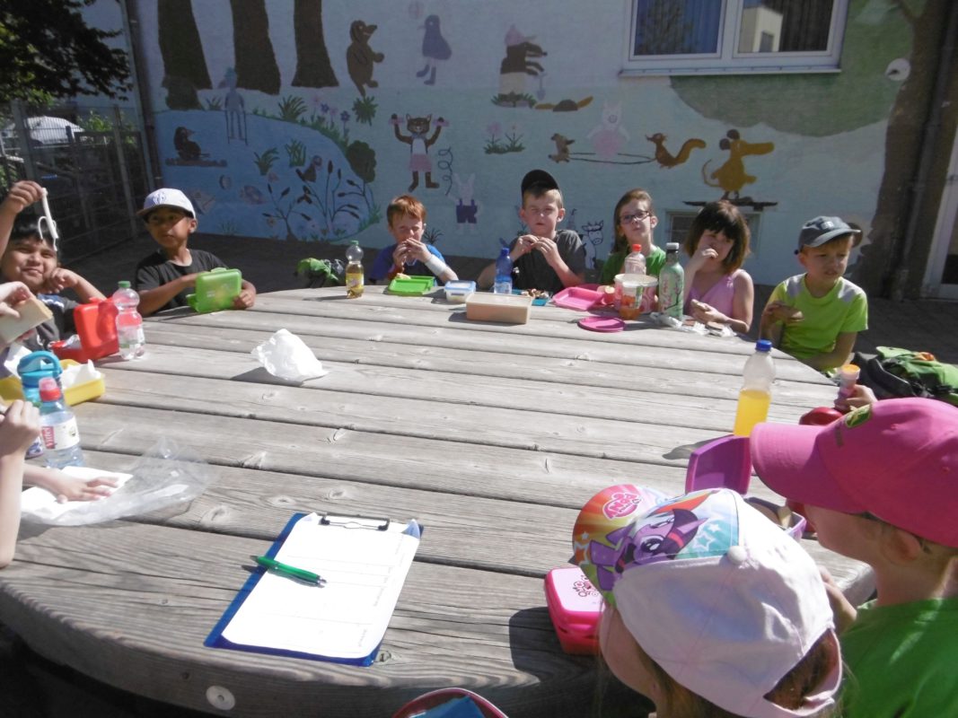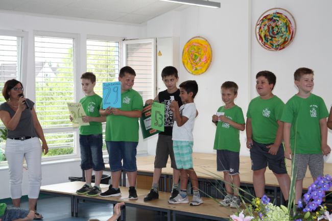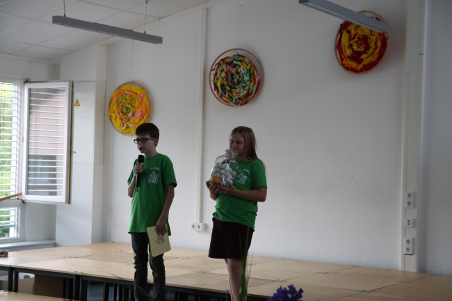 Nun kommen wir zur Schätzaufgabe des Monats. Wie viele Minigolf- und Tischtennisbälle sind ich unserem Schätzglas? Die Klasse 2a verkündet das Ergebnis und die Sieger.