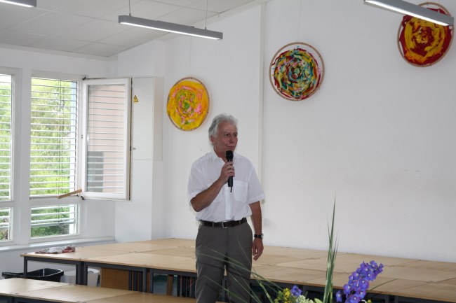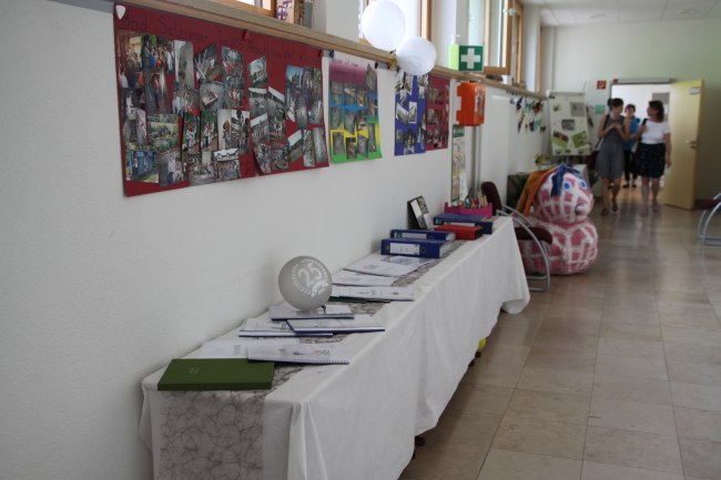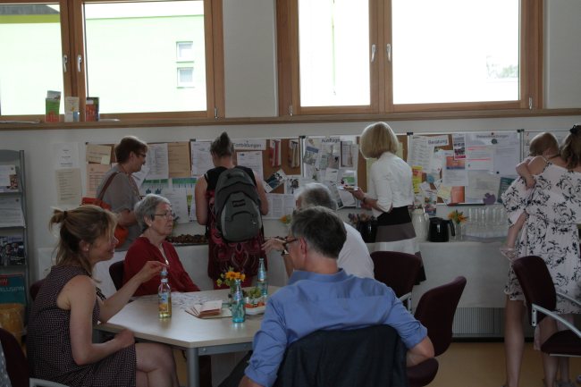 Frau Meier verabschiedet die Schülerinnen und Schüler, die nun ein wenig früher als gewöhnlich in ihren Schulbussen nach Hause fahren und lädt die Gäste zu einem kleinen Umtrunk und Häppchen im Verwaltungsgebäude ein.