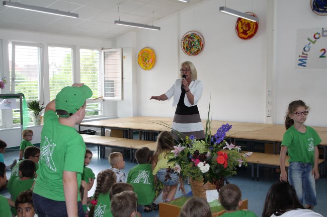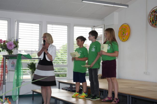 Auch die Schulelternbeiratsvorsitzenden Frau Unger und Herr Millmann kommen auf die Bühne und bekunden ihre Zufriedenheit mit der Mira-Lobe-Schule – „eine Schule, mit der sich die Kinder identifizieren können und in die sie gerne gehen. So wünscht man sich Schule.“