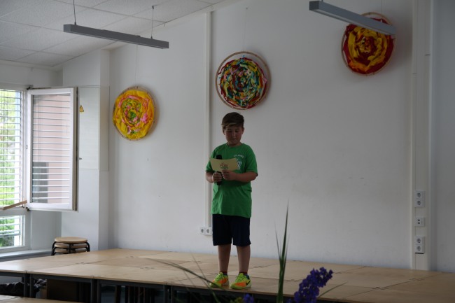 Der Wochenabschluss ist fester Bestandteil im Stundenplan der Mira-Lobe-Schule. Jeden Freitag treffen sich alle Schülerinnen und Schüler gemeinsam mit ihren Lehrerinnen in der Aula und zeigen auf der Bühne, was sie so alles gelernt haben.