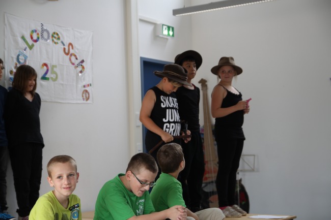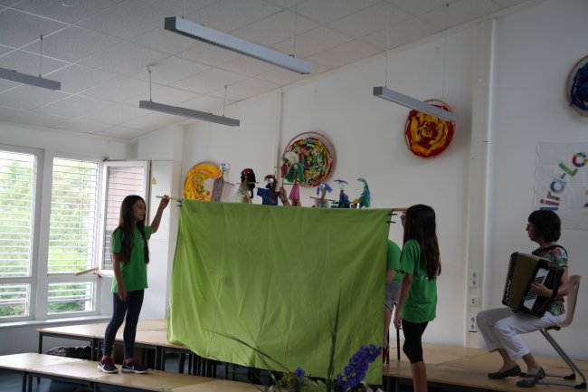 Und weiter geht es mit den Puppen-Theater der Klasse 3a und ihrem Lied „Wir sind die Kinder der Mira-Lobe-Schule“.
