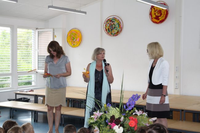 Auch die Schulleiterin der Stephan-Gruber-Schule Frau Lehr, die Schulleiterin der Regenbogenschule Frau Blitz und die Schulleiterin der Schule am Kiefernwäldchen Frau Krämer gratulieren.