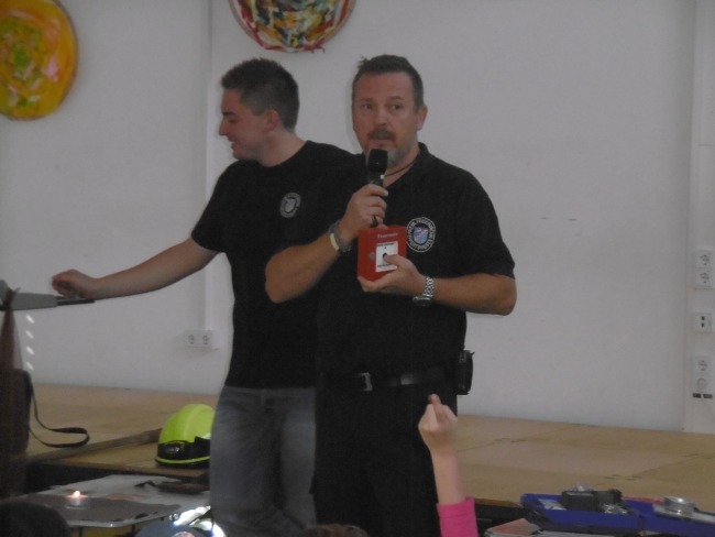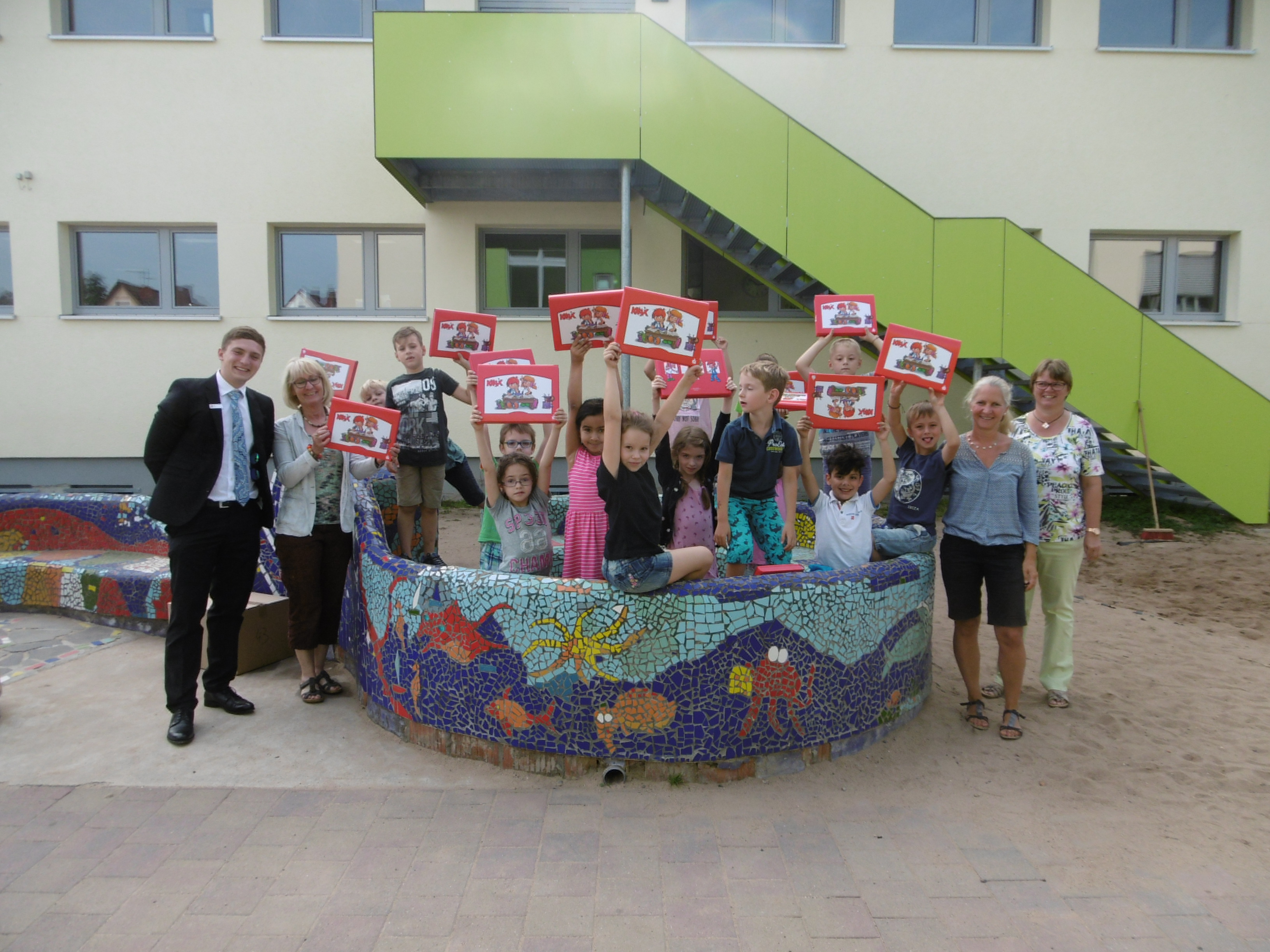 Herr Fleischmann überbringt Glückwunsche und auch ein Geschenk für die Schülerinnen und Schüler der Mira-Lobe-Schule.