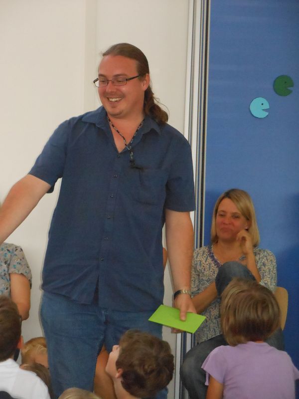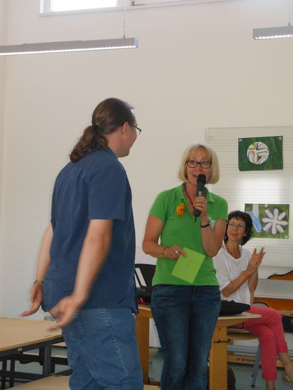 Im Anschluss zeigten die Klassen 3 und 4, welch rhythmisches Instrument ein gewöhnlicher Plastikbecher sein kann. Und dann hieß es auch Abschiednehmen von Herrn Kurz. Herr Kurz hatte in der Schülerbücherei der Mira-Lobe-Schule und der Stephan-Gruber-Schule gearbeitet. Der tosende Applaus zeigte deutlich, wie beliebt er bei den Schülerinnen und Schülern ist und dass sie ihn am liebsten in ihrer Bücherei behalten würden.