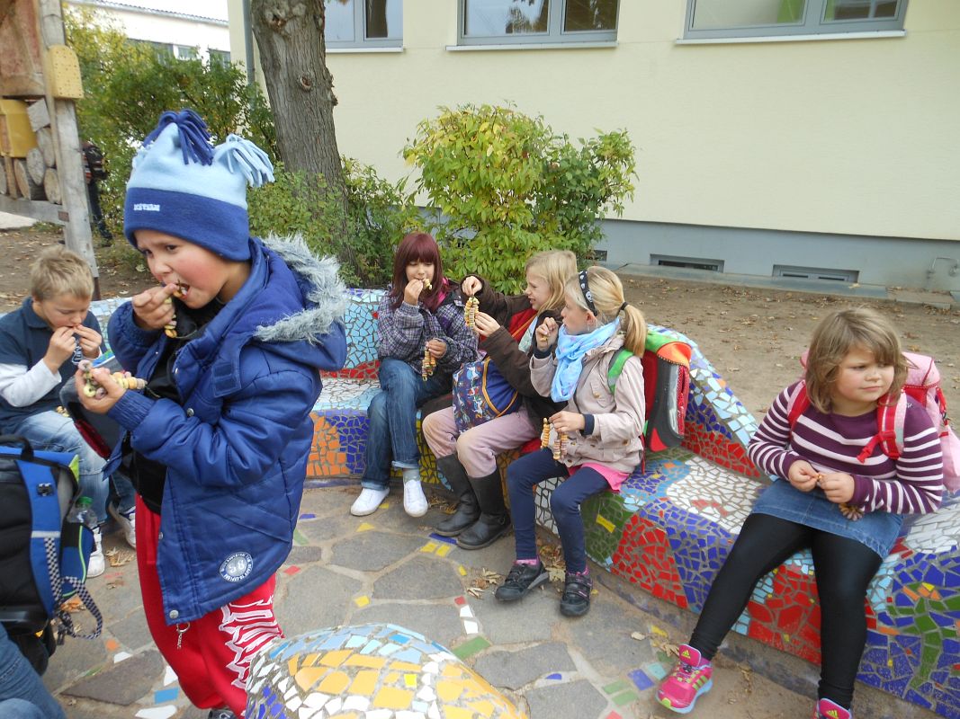 Aber auch auf den Fluren huschten fleißige Kellnerinnen und Kellner umher. Diese hielten die leckersten Häppchen bereit. Schaute man genauer hin, sah man, dass es sich bei diesen mit schicken Kellnerschürzen bekleideten Helfer um die Schüler der Klassen 5 und 6 handelte. Sie hatten gemeinsam mit ihrer Lehrerin Ulrike Lüdicke den ganzen Mittwochvormittag Fingerfood vorbereitet.