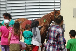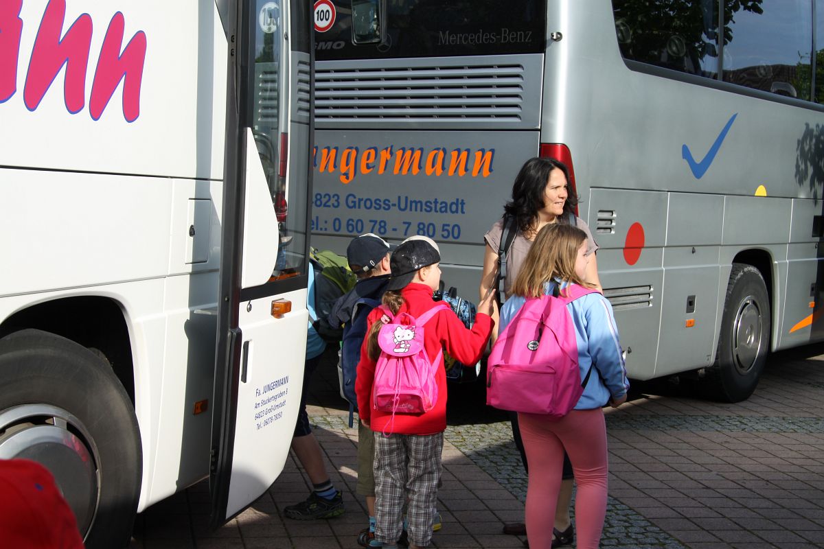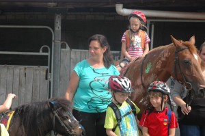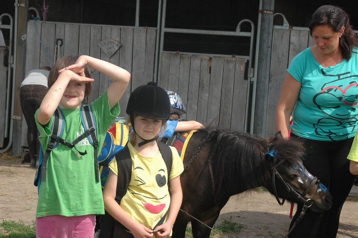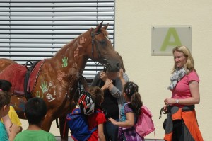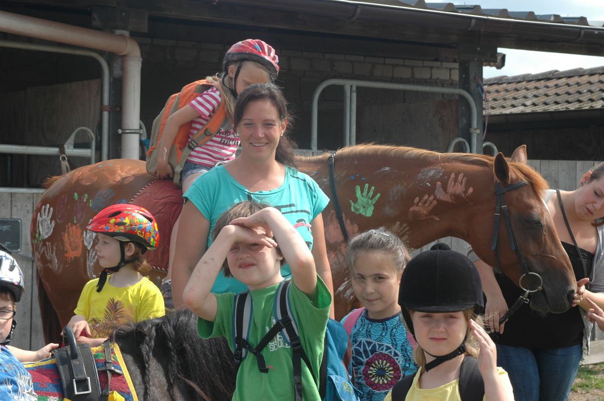 (Elefanten, Juli 2013) Ein kleiner „Bauernhof“ außerhalb von Eppertshausen ist unser Ziel. Wir, 8 Kinder im Alter zwischen 6 und 7 Jahren, Vorschulkinder der Sprachheilschule in Eppertshausen, eine Lehrkraft und eine Mutter als Begleitperson machen sich zu Fuß auf den Weg. Schon von weitem sehen wir das Dach der Scheune und bald begrüßt uns ein freundlich wedelnder Hund. Holzboxen mit Pferden, eine große Koppel mit Pferden und Ponys, ein Gehege mit gackernden Hühnern und hoppelnden Hasen nehmen unsere ganze Aufmerksamkeit in Beschlag. Kleine Augen von Katzenkindern schauen uns erwartungsvoll an und wir sind versucht sie zu streicheln und auf den Arm zu nehmen. Frau Voltz, die Reittherapeutin erklärt und zeigt uns den behutsamen und liebevollen Umgang beim Striegeln und Putzen von „Bonny“, dem Shetlandpony und „Andra“, der Fuchsstute. Heute dürfen wir sogar die Beiden mit Fingerfarben bemalen und verschönern. Viel Spaß und Freude sind dabei, aber auch ein beruhigendes und ausgleichendes Streicheln und Sprechen. Wir machen uns schon bald auf den Rückweg „hoch zu Ross“ durch blühende Wiesen und grünen Wald zur Schule. Dort erwarten uns staunende Schulkinder der Mira-Lobe-Schule. Wie lehrreich, abwechslungsreich und spannend so ein Schulalltag sein kann!