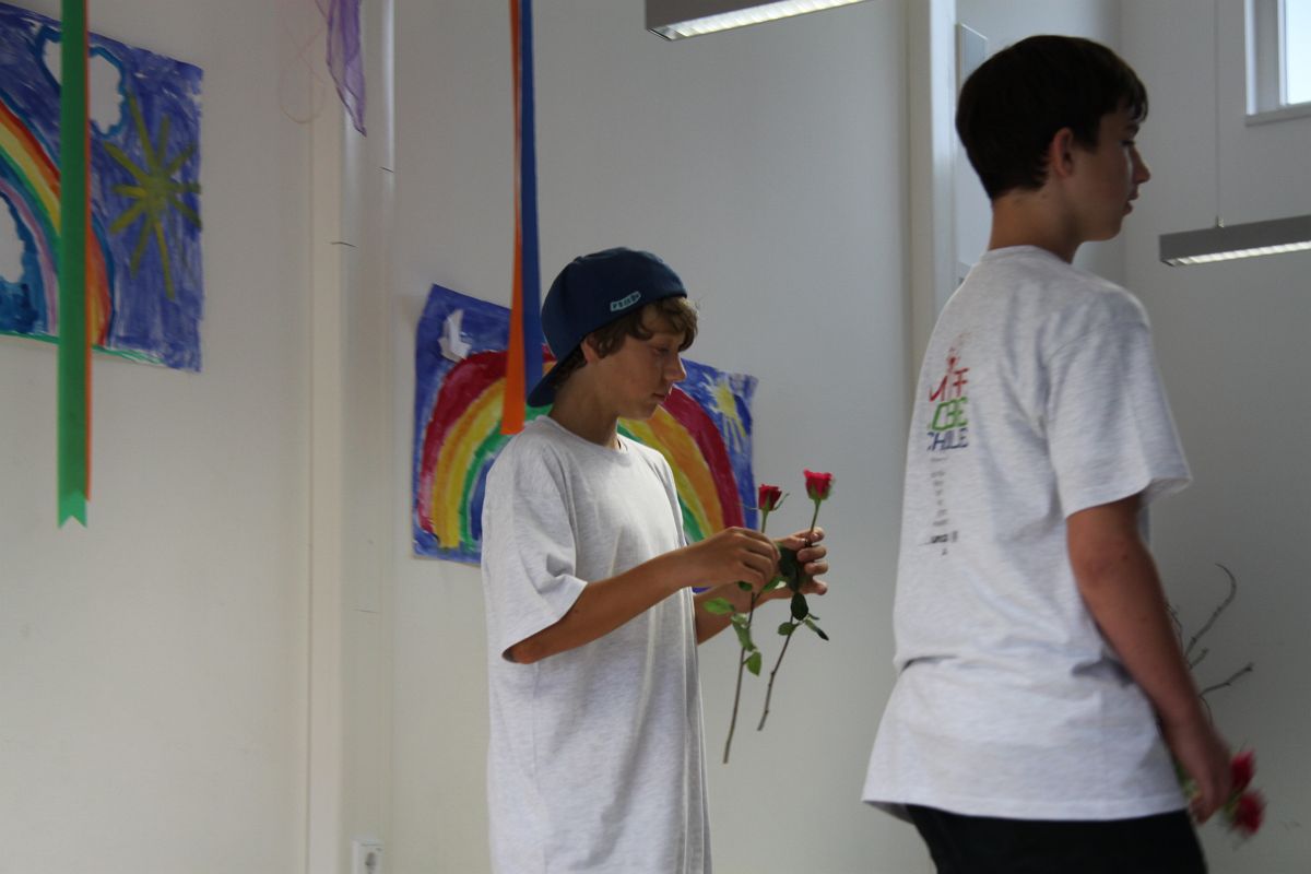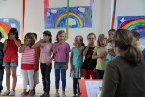 (Aktuelles, Juli 2013) Schon wieder ist ein ganzes Schuljahr um!Und so trafen sich alle Klassen der Mira-Lobe-Schule am 4. Juli 2013 in der dritten und vierten Stunde zur Jahresabschlussfeier. Jede Klasse hatte etwas für die Feier vorbereitet. So entstand ein kunterbuntes Programm:Es zeigten zum Beispiel die beiden ersten Klassen, wie man sich mit Hilfe des Tinto-Raps alle Laute bestens behalten kann. Die Klasse 1b führte „Theo, Theo“ auf. Die Klassen 5 und 6 sangen frei nach Sido den Song „Bilder im Kopf“. Die Vorklassen trugen ein Gedicht und ein Lied vom „Frosch“ vor. Die Klasse 2b spielte „Die Raupe Nimmersatt“. Das Buch „Irgendwie anders“ wurde von der ETEP-Gruppe vorgestellt. Die Klasse 2a sang das Lied „Der, die, das“. Die dritten Klassen sangen das Lied „Pippi Langstrumpf“. Die dritten Klassen und die vierte Klasse sang das Lied „Ferienzeit“ und die Tanz AG begeisterte alle Zuschauer mit dem Tanz „Ta Ka Ta“. Mit diesem wundervollen bunten Programm wurde aber nicht nur der Abschluss des Schuljahres gefeiert, sondern es wurden auch die Schülerinnen und Schüler der sechsten Klasse verabschiedet. Frau Meier trug die für unsere Verabschiedung der Klasse 6 schon traditionell gewordenen Worte von Wilhelm Busch vor: „Und so lautet der Beschluss, dass der Mensch was lernen muss!“. Außerdem überreichte sie allen Sechstklässlern eine kleine Schultüte. In dieser war diesmal auch ein Stein aus dem Luisenpark. Dieser soll die Schülerinnen und Schüler an ihren letzten Ausflug mit der Mira-Lobe-Schule erinnern, welcher am 1. Juli 2013 anlässlich des 20-jährigen Jubiläums unserer Sprachheilschule stattgefunden hatte. Gemeinsam mit ihrer Klassenlehrerin Frau Steinkopf betrat die Klasse 6 die Bühne und verabschiedete sich mit einem Vortrag, einem „Und tschüss!“ und mit Rosen für die Lehrerinnen.