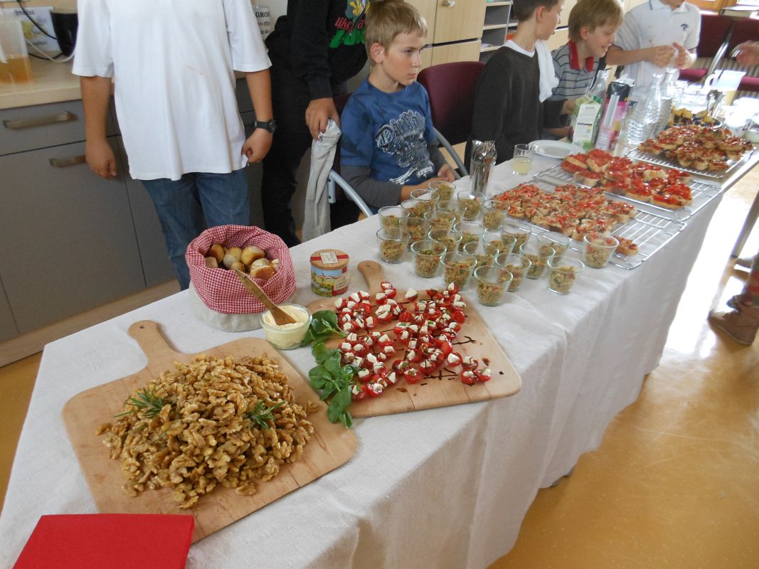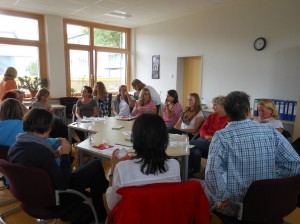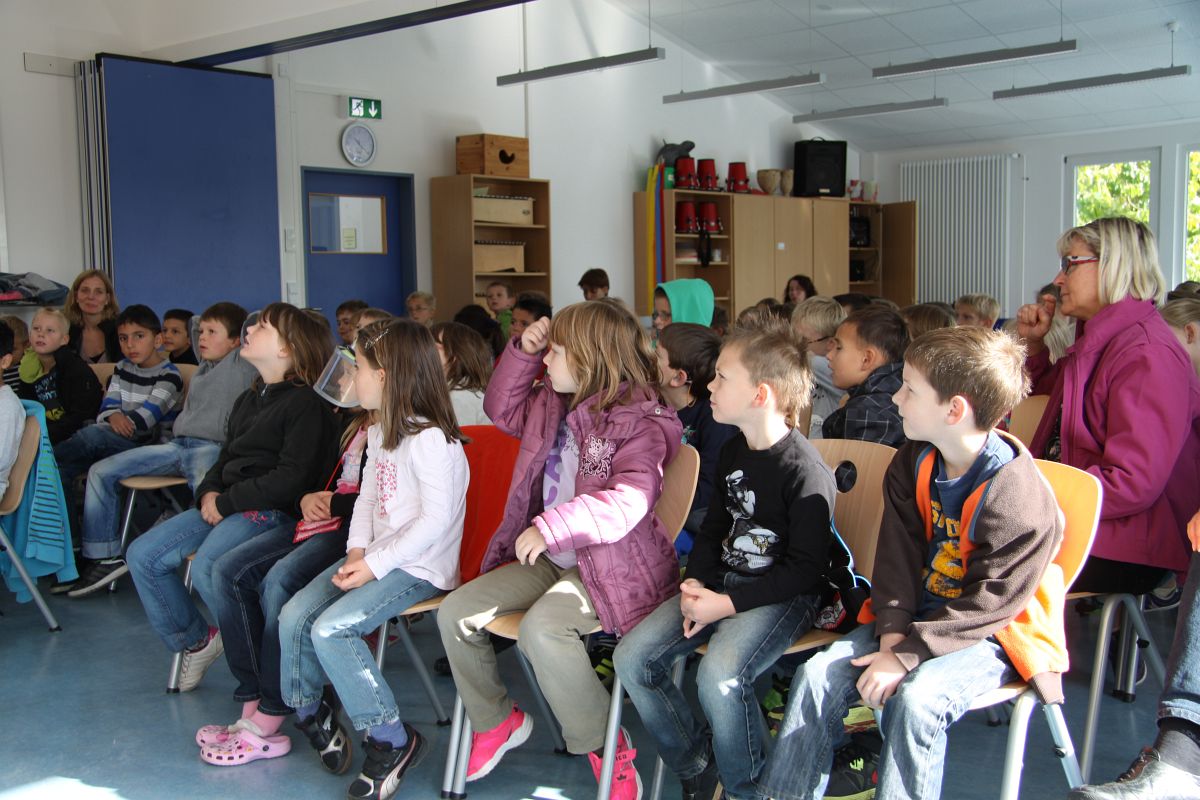 Informationen über den Ablauf der Veranstaltung entnehmen Sie bitte unserem Flyer! (Aktuelles, August 2013) „Wir würden gern einmal Ihre Schule und Ihre Arbeit kennen lernen.“ – so wünschte es sich die Integrations-AG der Kindertagesstätten des Landkreises Darmstadt-Dieburg. Diesem Wunsch folgend veranstaltete die Mira-Lobe-Schule am Dienstag, 27.08.2013 einen Informationsnachmittag für die Erzieherinnen der Integrations-AG. Um 14.00 Uhr im Lehrerzimmer der Mira-Lobe-Schule trafen sich die Erzieherinnen und einige Lehrerinnen der Mira-Lobe-Schule. Hier konnte man sich kennenlernen, ein wenig plaudern und vor allem kleine Köstlichkeiten, die von der Klasse 5/6 unter der Leitung von Frau Ulrike Lüdicke im Arbeitslehre-Unterricht vorbereitet wurden, genießen. Weiter ging es dann im Klassenzimmer der Klasse 5/6. Dort begrüßte die Schulleiterin Jutta Meier die Gäste und erläuterte den weiteren Ablauf der Veranstaltung. Karin Wörth gab einen Überblick über sprachliche Auffälligkeiten und zeigte Unterscheidungsmerkmale von normaler und auffälliger Sprachentwicklung auf. Anschließend erklärte Frau Meier den „Weg in die Sprachheilschule“, also, welche Schritte veranlasst werden müssen, damit ein Kind in die Sprachheilschule eingeschult werden kann. Mit einer Fragerunde, in der offene Fragen geklärt werden konnten, wurde der Informationsteil im Plenum abgeschlossen. In zwei Gruppen hatten die Erzieherinnen nun auf einem Rundgang durch die Mira-Lobe-Schule die Möglichkeit, sich ein Bild von der Schule zu machen. Auf diesem Rundgang erhielten die Gäste außerdem an drei Stationen Informationen zu der tagtäglichen Arbeit der Lehrerinnen. Kerstin Krautwurst stellte die Arbeit in der Vorklasse vor und informierte über das Sprechzeichnen. Ursula Beyer „öffnete“ die Türe ihrer ersten Klasse und zeigte den Ablauf einer Buchstabeneinführung. Viola Scheer gab in einem der Therapieräume Einblicke in den Zusammenhang von Mathematik, Sprache und Sprachförderung anhand einer mathematischen Fördereinheit. Die Erzieherinnen bedankten sich bei der Klasse 5/6 für die hervorragende Bewirtung und bei den Lehrerinnen für die vielen Informationen rund um die Sprachheilschule. Mit vielen Eindrücken im Gepäck machten sie sich dann um 16.00 Uhr auf den Heimweg. Die erste Sitzung des Schulelternbeirates im Schuljahr 2013/2014 findet am Dienstag, 1. Oktober 2013 um 20.00 Uhr im Lehrerzimmer der Mira-Lobe-Schule statt. (Aktuelles, August 2013) Am Dienstag den 20. August 2013 war es soweit – Der erste Schultag für die neuen Vorklassen und die neuen ersten Klassen. Zunächst konnten die Schülerinnen und Schüler gemeinsam mit ihren Familien am ökumenischen Einschulungsgottesdienst teilnehmen. Dieser fand in der Kirche St. Sebastian in Eppertshausen statt. Gespannt warteten die Kinder und Eltern auf dem Schulhof auf den Start der Einweihungsfeier. Um kurz nach zehn machten sich alle auf den Weg in die Aula der Mira-Lobe-Schule… … und suchten sich einen Platz … …und warteten gespannt. Endlich ging es los! Die Schulleiterin Frau Meier begrüßte die Schulanfängerinnen und Schulanfänger und ihre Familien. Anschließend führten die Klassen 2a und 2b zur Einstimmung, was man so alles in der Mira-Lobe-Schule lernen kann, den Tinto-Rap auf.
