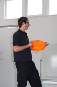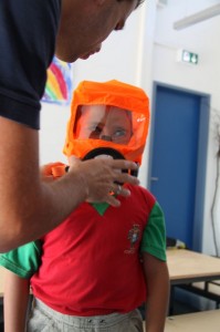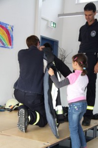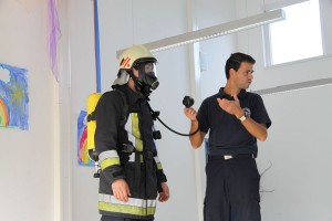 Nun atmete er und rief: „Ist hier jemand?“. „Das hört sich an wie Darth Vader“ riefen einige Schüler. Wie auch immer, in jedem Falle merkwürdig. „Wenn ihr diese merkwürdigen Atemgeräusche hört, müsst ihr keine Angst haben. Versteckt euch nicht. Ruft den Feuerwehrleuten zu, wo ihr seid, damit sie euch retten können.“, so betonten es Herr Gruber und Herr Schrod.