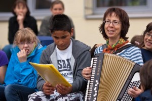 Frau Greiner begleitet die Schülerinnen und Schüler mit dem Akordeon